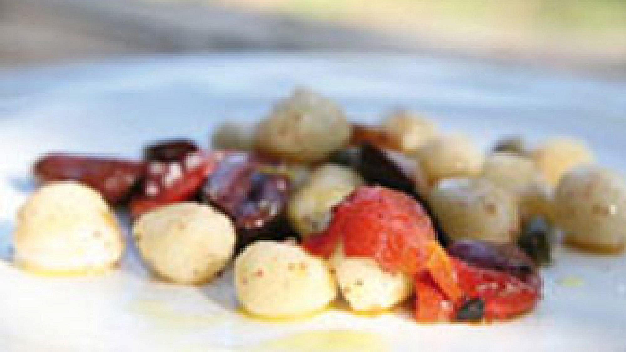 - קולים את הפלפלים על אש גלויה או בתנור. מקלפים ומסירים את הגרעינים וחותכים לקוביות של 1 ס"מ.