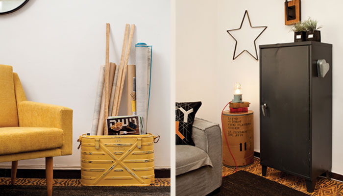 מימין: קרן יצחק צבעה את ארונית הברזל הישנה בצבע שחור של נירלט וכעת היא משמשת כמקור אחסון שאינו משתלט על החלל. משמאל: מכל מתכת שודרג ונצבע על ידי מאיה גל מ-Mayard והונחו בו גלילי ניירות שרטוט וסרגלי עץ שמוסיפים נגיעה אורבנית לעיצוב החדר