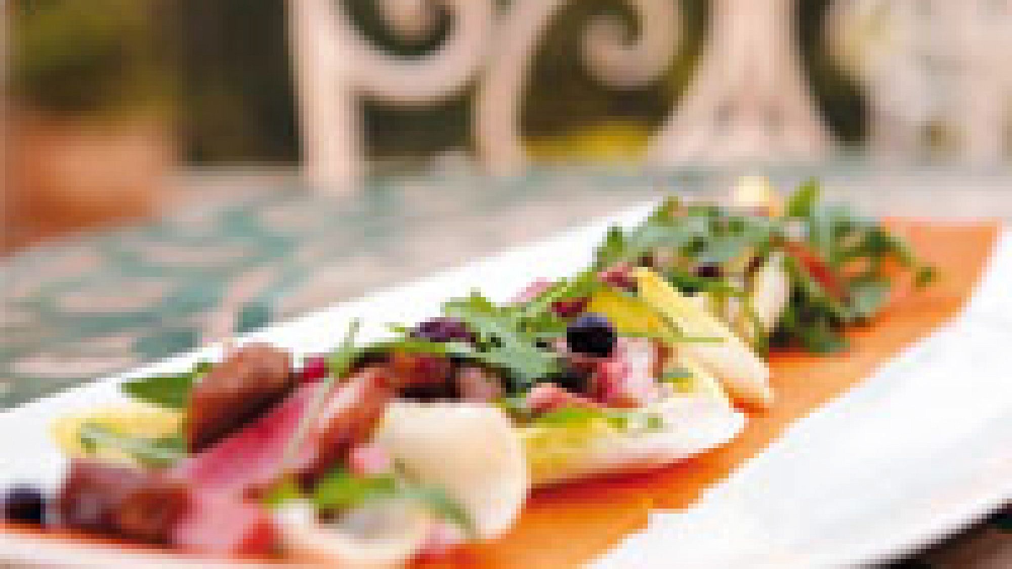 פורסים את חזה הברווז דק ומערבבים עם כל יתר מרכיבי הסלט, מלבד הדלעת.