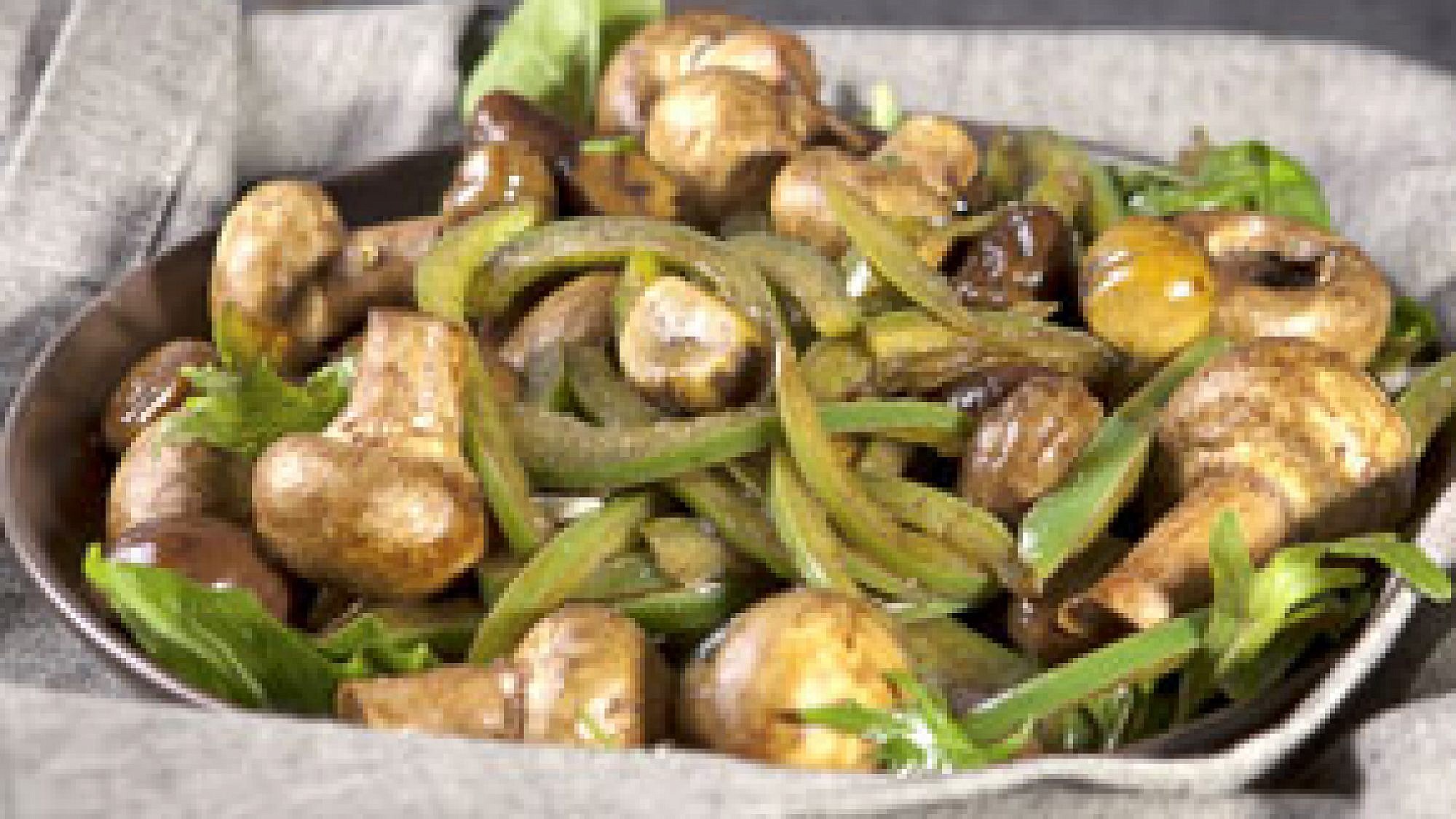 3. מטגנים בשמן הזית במחבת את השום, הפלפלים, הפטריות והערמונים. מוסיפים את הסויה והחומץ הבלסמי ומקפיצים קלות. מוסיפים את עלי הבזיליקום ומסירים מהאש.