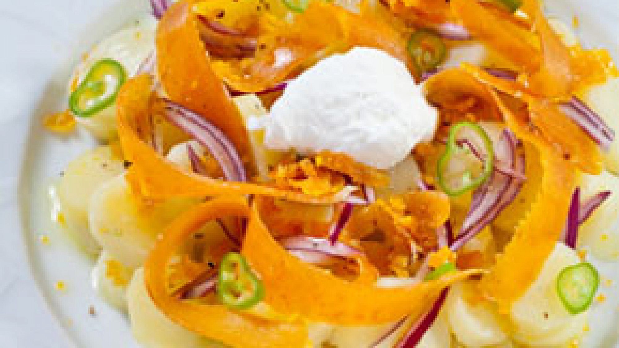 3. מסדרים את תפוחי האדמה בצלחת הגשה, מפזרים עליהם את הבצל הסגול, הבוטרגו המגורר ופרוסות הבוטרגו, ומגישים לצד השמנת החמוצה.