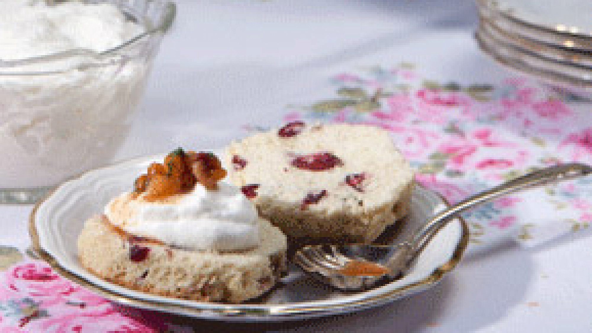 אין תה אנגלי של אחר הצהריים ללא סקונס - לחמניות חמאה מהירות הכנה. בגרסה שלנו הלחמניות מוגשות עם קציפת יוגורט עדינה וסלט נקטרינות מתובל