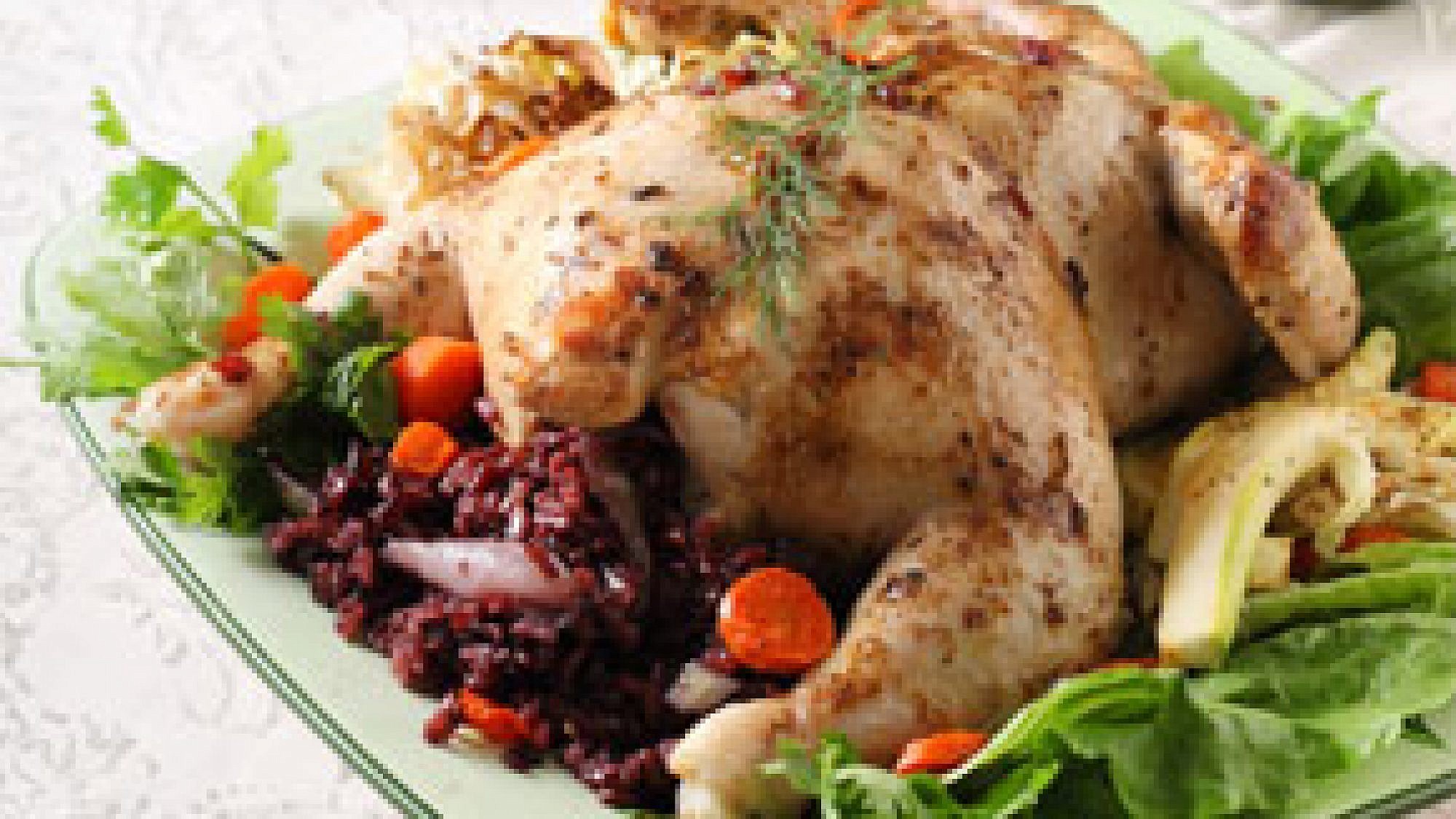 2. ממלאים את העוף בתערובת האורז ומעבירים בזהירות לתבנית אפייה, מתבלים את העוף בתערובת תיבול לגריל.