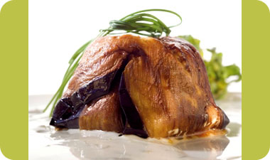 • 2 חצילים קלופים פרוסים לאורך וקלויים בתנור או בגריל.