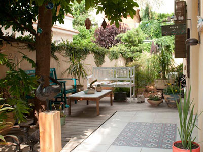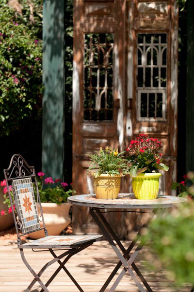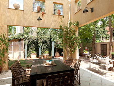 החצר היא חלק חשוב מהבית, והיא מקיפה אותו משני עבריו. מרפסת הגן, היוצאת מהמטבח, מרוצפת באריחי הגרניט פורצלן הבהירים שמרצפים את הבית כולו, אבל הונחו האריחים בה הונחו באלכסון, מה שיוצר הפרדה ויזואלית בין החללים. המרפסת מוקפת בקירות פטיו מרובי פתחים ובמרכזה ניצב שולחן אוכל גדול וסביבו כיסאות. על דק העץ המקיף את המרפסת ניצבת פינת הסבה מקש, ולצדה פינת ישיבה נוספת בסגנון מרוקאי.