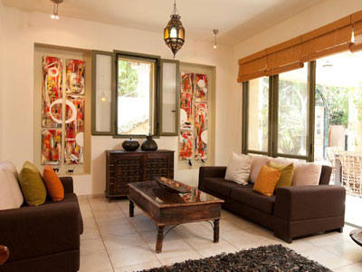 את שתי פינות הישיבה מאחדים שני שטיחים קלועים מרצועות עור חומות ושלוש מנורות תלויות מברזל ומזכוכית צבעונית בסגנון מרוקאי. נישות בנויות סביב קירות הסלון שנצבעו בצבע חאקי בהיר משמשות כחלל תצוגה לציוריה של לוי. היא מספרת כי הסלון משמש גם מעין גלריה להצגת ציוריה, והנישות נבנו כדי לתת להם מסגרת מתאימה. נישה מרכזית בסלון, המשמשת כרקע לקמין הברזל המחמם את הקומה הראשונה כולה, נצבעה בגון אדום-בורדו המדגיש את הקמין השחור ומייצג את אלמנט האש.