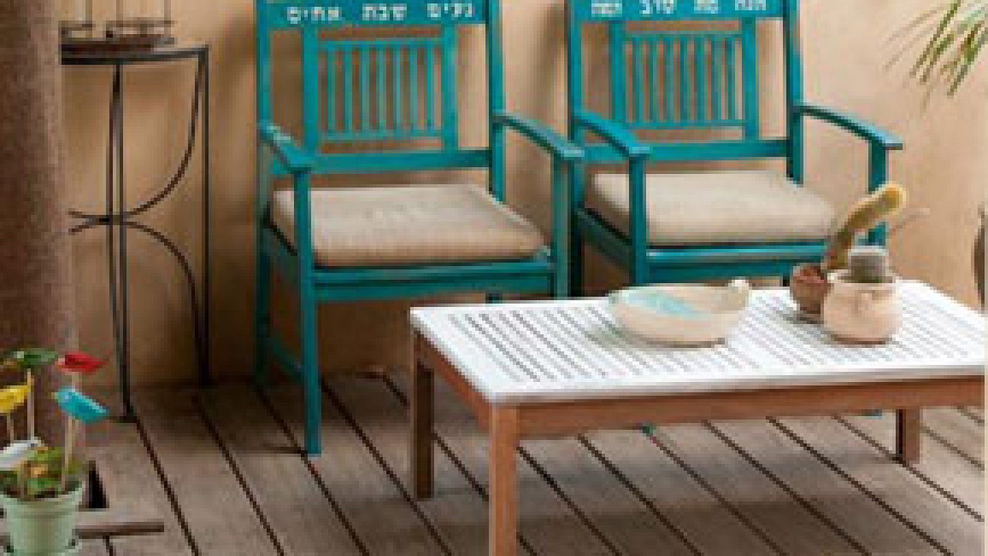 בכניסה לבית ניצבת פינת ישיבה נוספת על דק מעץ. לוי מספרת כי גם בפינה זו היו רהיטי העץ חומים כמו בשאר חלקי הבית, אבל הם נצבעו בלבן, "כדי לשדר אווירה יותר ים תיכונית וקלילה". במהלך הצביעה שילבה לוי על הרהיטים משפטים הומוריסטים כמו "זהירות צבע טרי". "זה נותן אווירה טובה עוד לפני שנכנסים הביתה", היא אומרת. "ככה נכנסים הביתה עם חיוך".