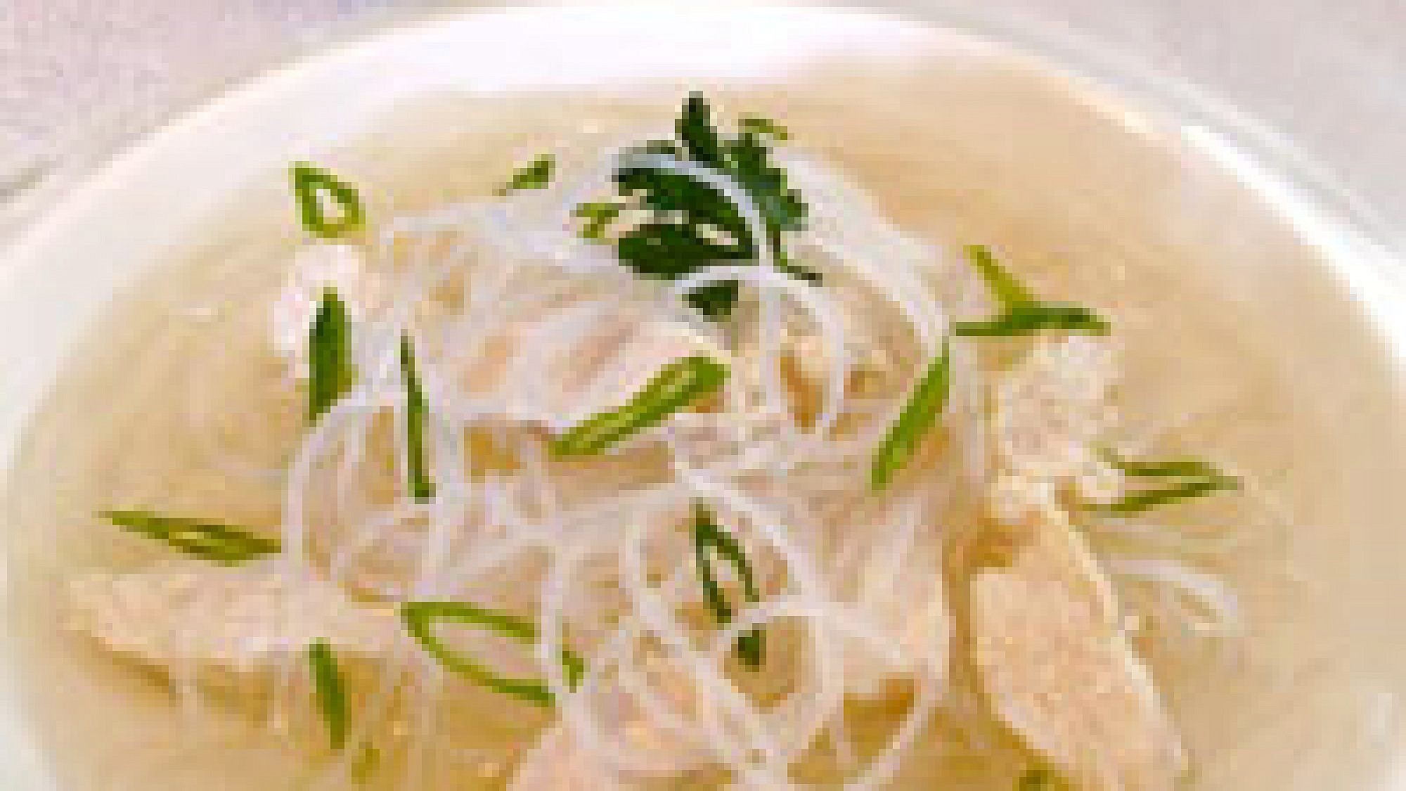 3. מניחים בכל צלחת אטריות, מעליהן נתחי עוף, יוצקים מהקונסומה החם ומפזרים בצל ירוק.