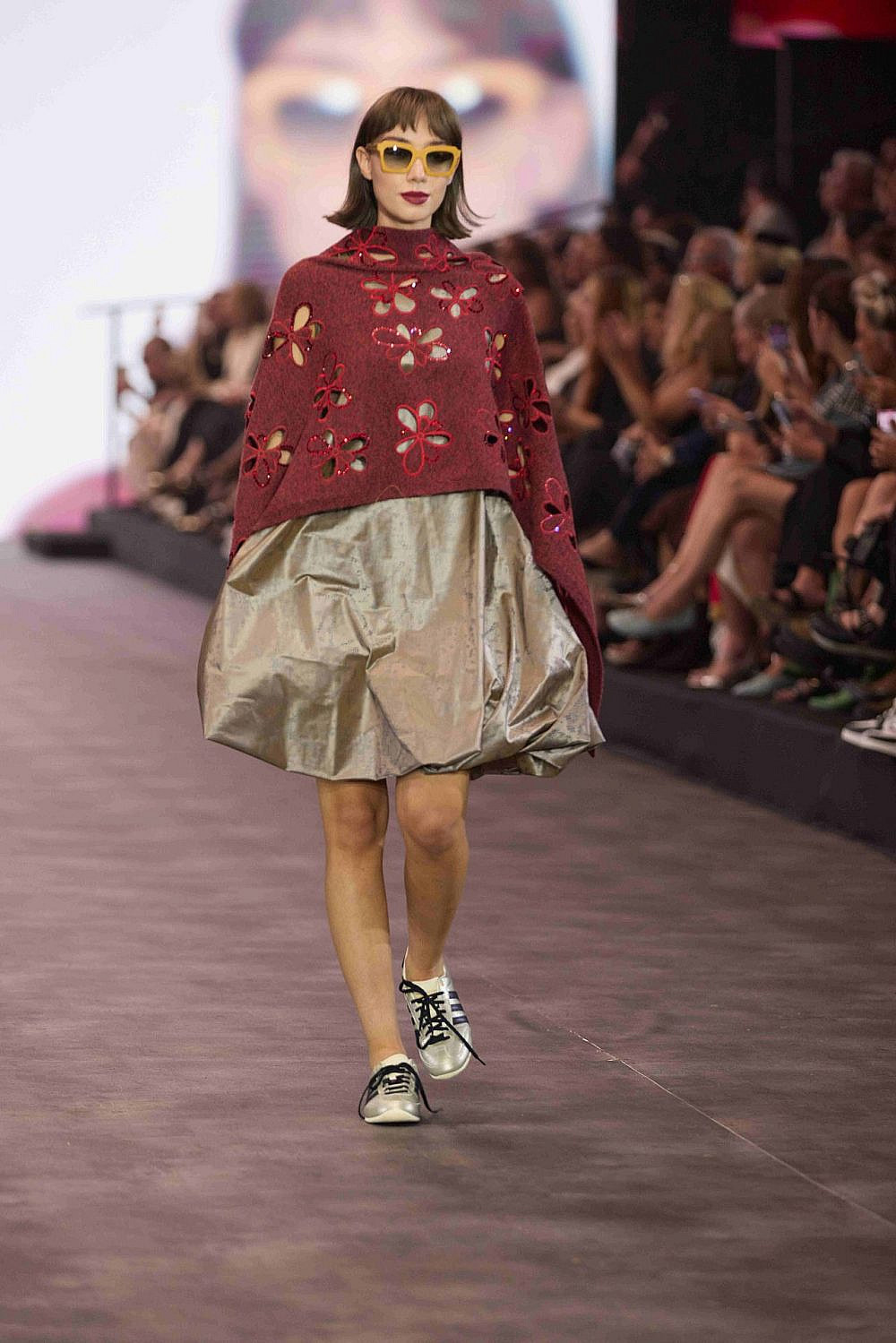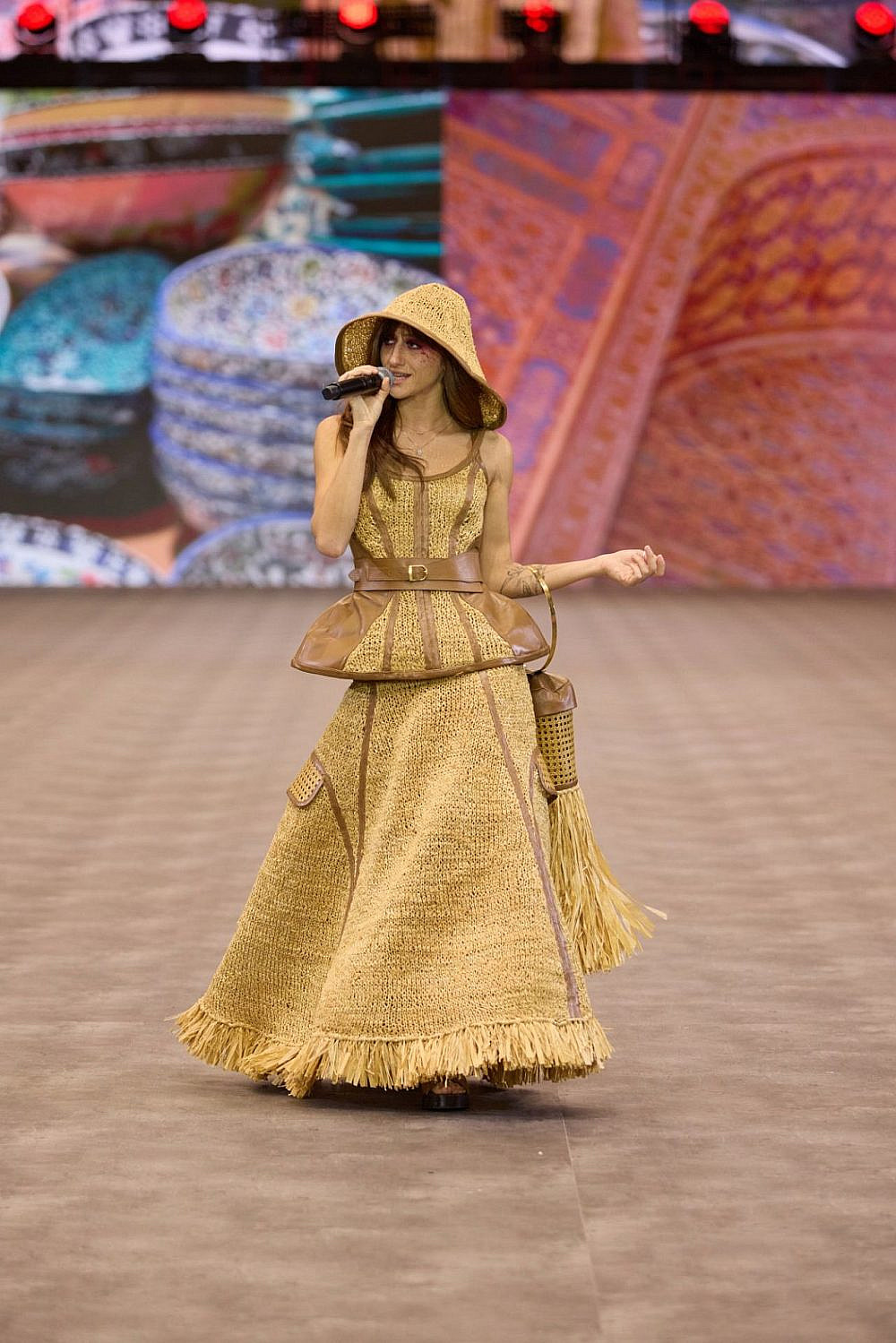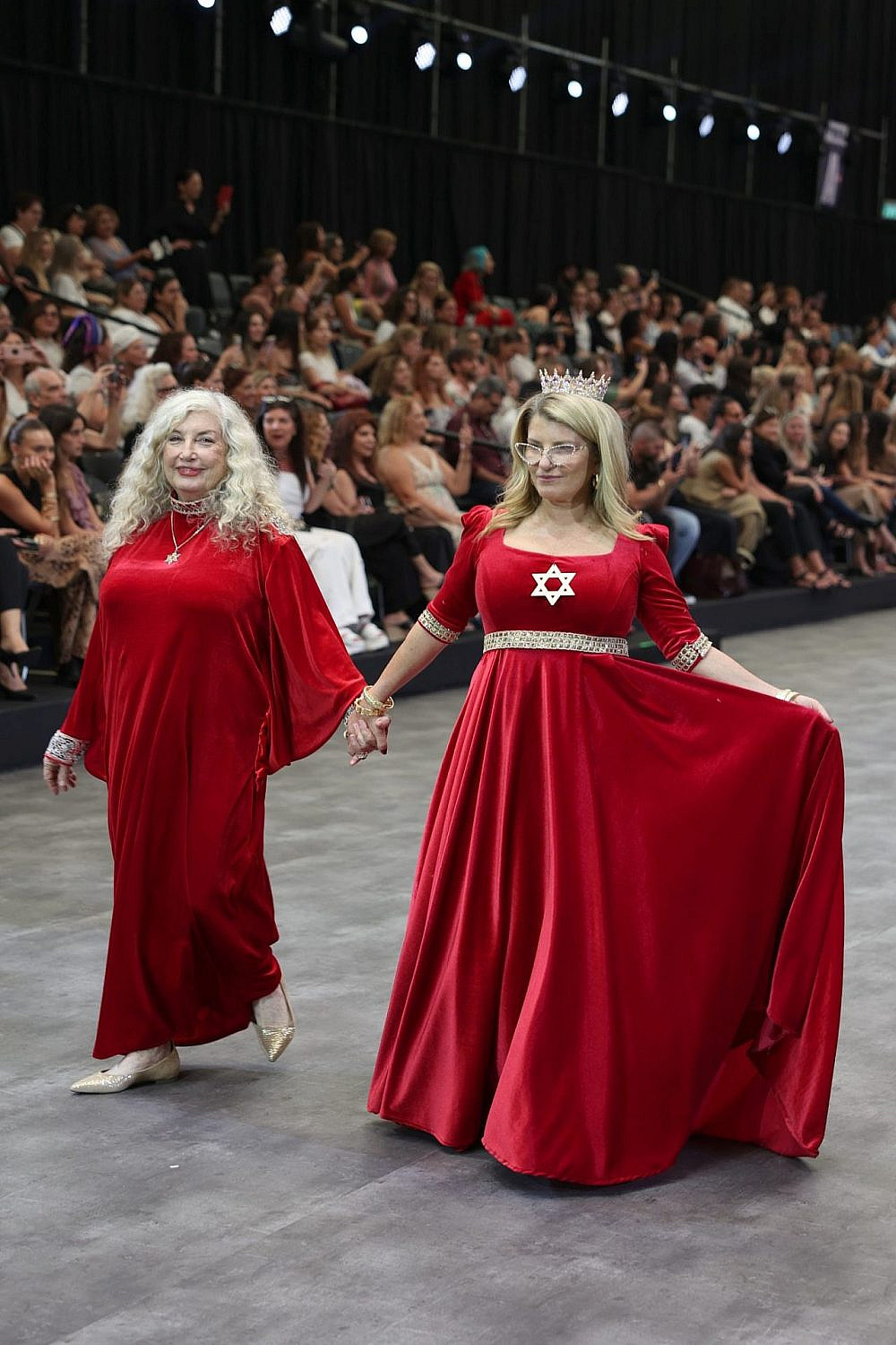 תצוגה נוספת שתפסה את תשומת הלב שלנו הייתה של המעצבת טובהל’ה חסין. הקולקציה החדשה, "מלכת מחשבת", נולדה ממפגש בין עבר לעתיד – רקמות גובלן עתיקות שטובהל’ה ובתה נעמה פירשו לשפה נשית, עכשווית ואמיצה. השילוב בין בדי משי, אבני סברובסקי ונעלי Adidas יצר דיאלוג מפתיע בין עוצמה לנוחות. "בזמנים כאלה חייבים נעליים נוחות – שיהיה קל לרוץ למקלט", אמרה טובהל'ה, במשפט שהפך לרגע בלתי נשכח על המסלול. על חלק מהדגמים הופיע התאריך – 7.10, כמחאה על ניסיון הממשלה לטשטש את המחדל ושינוי שם המלחמה. ההפתעה המרגשת של הערב נרשמה כשהמילארדרית והפילנתרופית מרים אדלסון נכחה בתצוגה, ונכדתה, שירה לוקץ' (בתה של הכרישה יסמין לוקץ'), צעדה על המסלול – רגע בין־דורי שהגדיר את רוח הערב.