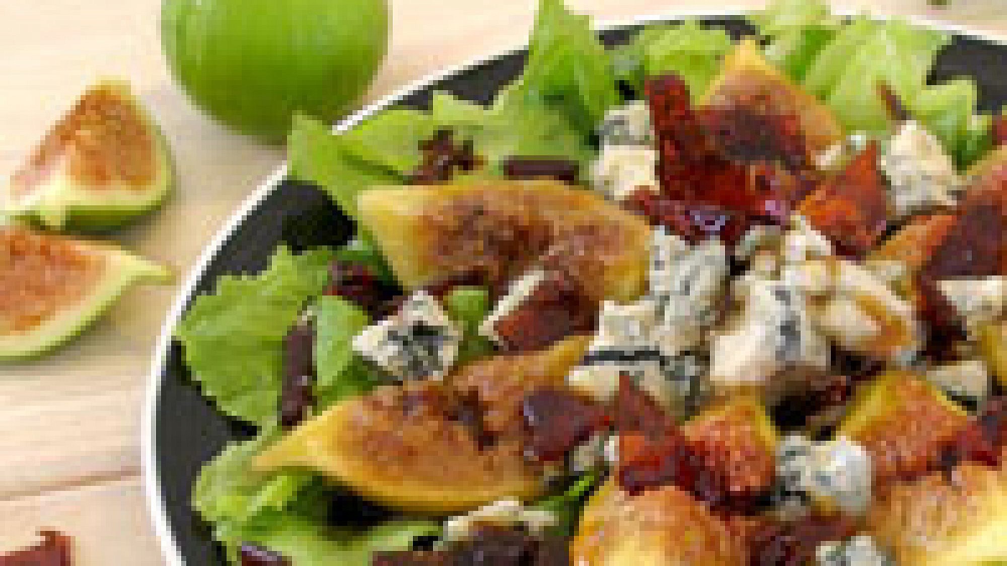 1. מניחים את עלי הסלט על צלחת הגשה ומתבלים בשמן זית, בחומץ בלסמי ובמלח. מניחים מעל את התאנים המזוגגות ומפוררים את הגבינה הכחולה.