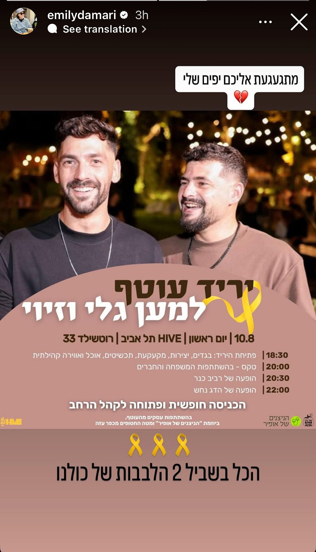 דמארי שיתפה בסטורי שלה פרטים על אירוע מיוחד שיתקיים למען חבריה בראשון (10.8), בבר ה-HIVE בשדרות רוטשילד בתל אביב. "מתגעגעת אליכם יפים שלי", כתבה דמארי, והוסיפה: "הכל בשביל שני הלבבות של כולנו".