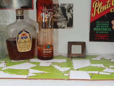 פינה במטבח. שברי חרסינה שחוברו למשטח דקורטיבי