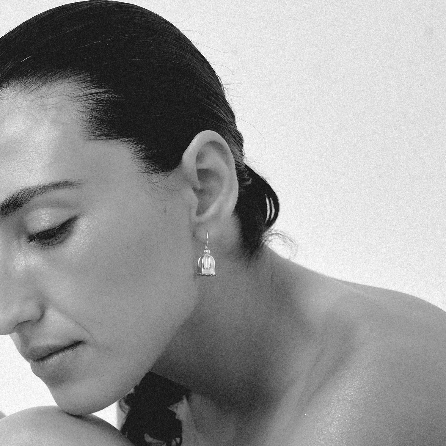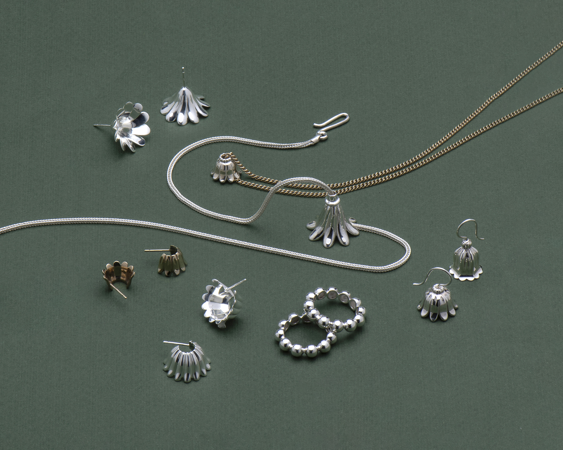 התכשיטים עוצבו בהשראת קישוטים אדריכליים פרחוניים מתקופות וממקומות שונים, וכל אחד יותר יפה מהשני. הקולקציה מורכבת מארבעה סוגי עגילים, שתי שרשראות וטבעת, ובגדול היינו שמחות לקנות כאן הכל. אהבנו במיוחד את עגילי החישוק המתוחכמים שמרפררים לעלי הכותרת של הפרחים בצורה מרומזת יותר, ומזכירים גם את קרני השמש מזוויות מסוימות. הם מגיעים בשני גדלים ומשני חומרים שונים, וההמלצה שלנו: לקנות אחד כסוף וגדול ואחד זהוב וקטן, וללכת על מראה א-סימטרי למבינות עניין.