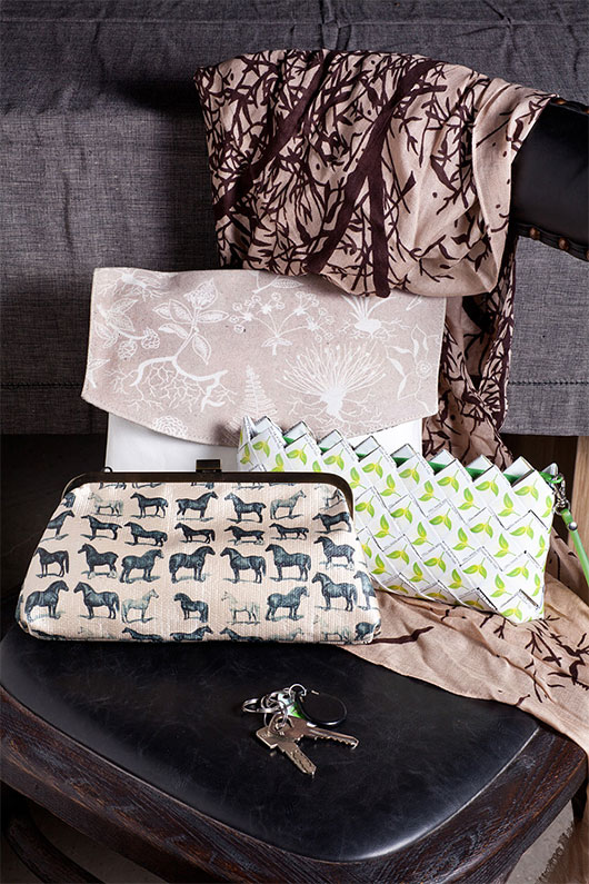 קלאצ' סוסים, 349 שקלים. עדי אמיתי # קלאצ' עלים ירוקים, 330 שקלים. Madeo אקו שיק # קלאצ' עם הדפס צמחייה, 220 שקלים. Simsisters # צעיף עם הדפס ענפים של המותג Lisabeth Dahl, 139 שקלים. שרון שיאון לוי