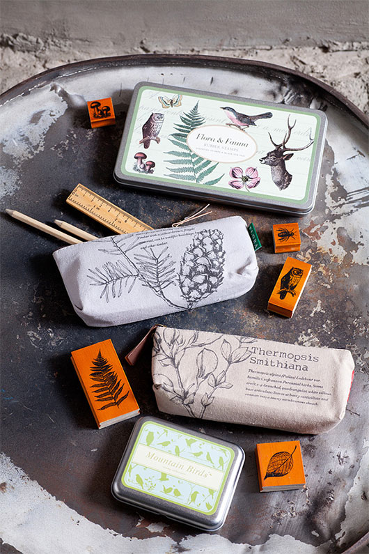 קלמרים מפשתן עם הדפס ענפים ואצטרובל, 45 שקלים ליחידה; ערכת חותמות ציפורים, 29 שקלים. תמר בר # ערכת חותמות עץ גדולה Flora&Fauna, 149 שקלים. יולטה