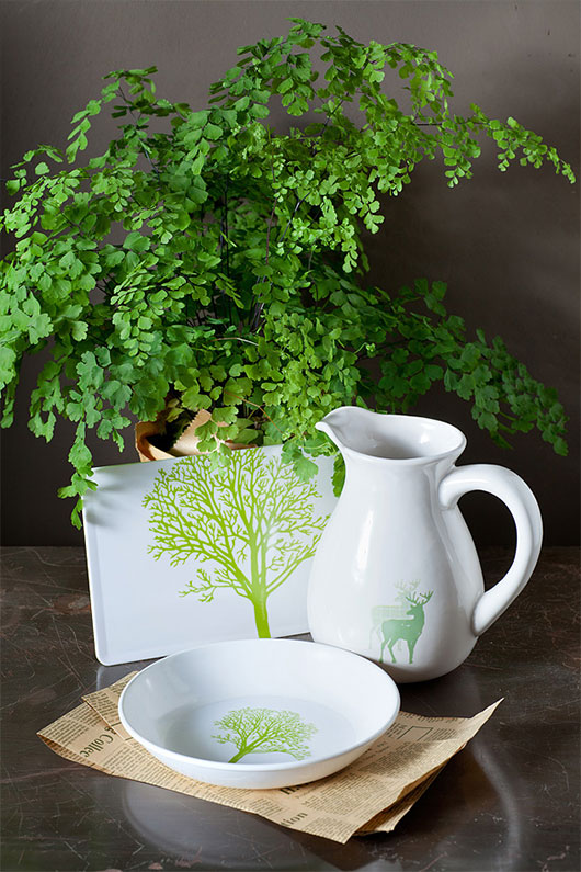 קנקן עם הדפס איילים, 150 שקלים. זוהר שחם # קרש עם הדפס עץ לחיתוך ולהגשה, 66 שקלים; קערה עם הדפס עץ, 55 שקלים. Nonna Peppy
