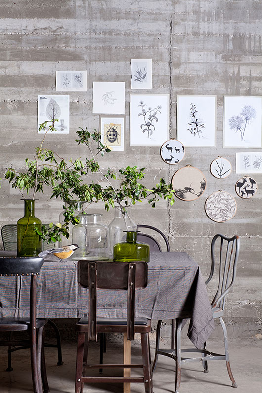 שולחן עץ, 14,500 שקלים; כיסאות שונים, 950־1,900 שקלים ליחידה; אגרטלים מזכוכית ירוקה, גדול, 290 שקלים, קטן, 270 שקלים ליחידה. האסם # אגרטלים שקופים שונים, 158־244 שקלים ליחידה. OAKY # מפה מכותנה אפורה, 2.00X1.50 מ', 120 שקלים. יעקב טווינה # ציפור בטכניקת ליבוד, 300 שקלים. אמנות הליבוד # שלישיית פוסטרים של צמחים, 90 שקלים ליחידה. הביתה # תמונות חישוקים, 150-89 שקלים ליחידה; פוסטר מרובע עם איור עלים, 99 שקלים. חמוטלת # פוסטר חיפושית, 69.60 שקלים. Paper Bella