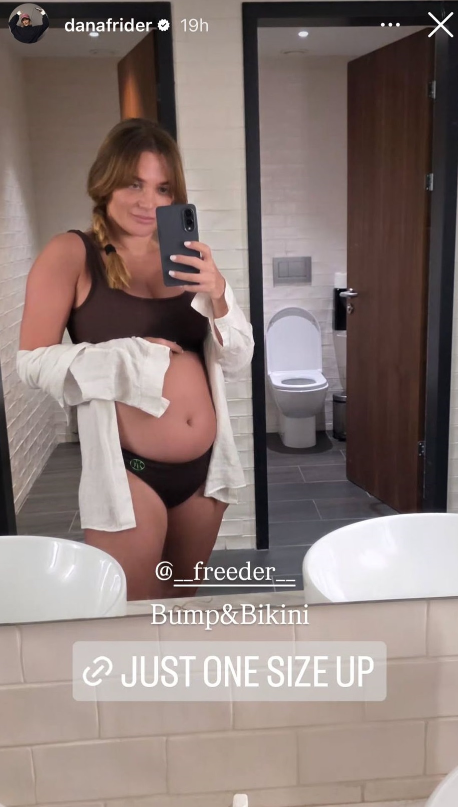בתמונה, פרידר מצולמת בביקיני חום של מותג האופנה הספורטיבי שלה Freeder, אותו היא מלווה בכיתוב "Just One Size Up" – כי גם בהיריון, הסטייל לא הולך לשום מקום, הוא רק מתרחב קצת. עם מכופתרת לוס פתוחה, צמה בצד ומבט מחויך, דנה המהממת זורחת גם מהשירותים של המלון. כזכור, הזוג המאושר שיתף רק לפני ימים ספורים את הבייבי ניוז שהרעידו את הרשת, וכעת כבר נראה שפרידר מוכנה לעדכן אותנו בכל שלב במסע; בסטייל שלה, בקצב שלה, ובלי לוותר על אף פריים לוהט.