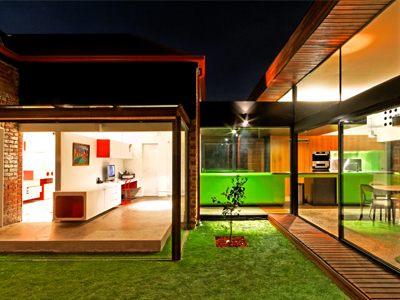חלל ההרחבה בלב החצר מגדיר אותה מחדש ומחלק אותה לשני חלקים. חלק אחד הוא החצר שבין הבית הישן וההרחבה, שהופכת להיות גם החצר הפנימית של הבית והיא כולה מדשאה ירוקה