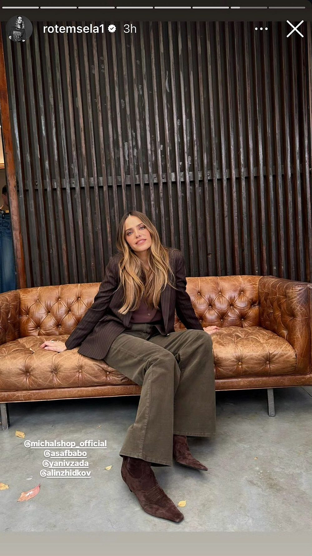 טוטאל לוק חום: חולצה מכופתרת חומה, בלייזר פסים גברי, מכנסי קורדרוי מתרחבים ומגפי זמש – כל פריט בגוון שוקולד שונה, משחק חכם של צבעים ומרקמים שמרחיק את הלוק ממראה אחיד ומשעמם.
