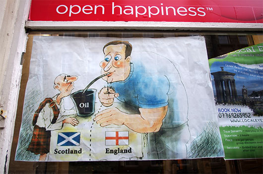 בלב אדינבורו, בירת סקוטלנד, ליד הגלריה הלאומית, מצויר על עמוד קטן צלב אנדראס הקדוש (צלב אלכסוני) בצבע לבן על רקע כחול – כדגלה של סקוטלנד. "הצביעו 'כן'", נאמר בציור הגיר, "שגשוג, שוויון, שלום, חירות". ב-18 בספטמבר יחליטו תושבי סקוטלנד אם להיפרד מהממלכה המאוחדת ולהפוך אחרי כשלוש מאות שנים של שותפות למדינה עצמאית. מי שיצביע "כן" יצביע בעד עצמאות, ומי שיצביע "לא" – בעד הישארות בממלכה. לגבי שגשוג, שוויון וחירות, העתיד קצת יותר מעורפל.