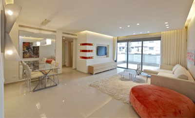 ספה פינתית גדולה בגוון בהיר, שטיח בשמנת ורהיט מינימליסטי מולם מאפיינים את המרחב המיועד יותר לאורחים וקצת פחות לבני הבית. פינת האוכל המכילה במצבה הסגור ארבעה סועדים, מצאה את מקומה בכניסה למטבח. בצמוד אליה נבנתה נישה גדולה ובתוכה הותקנה, מגובה הרצפה, מראה עצומה המכפילה את גודלו של השולחן ופותחת במשחק התעתועים המאפיין את הדירה כולה.