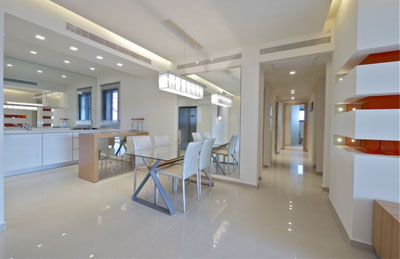 בסלון וביחידת ההורים תקרות מונמכות המשלבות תאורה היקפית נסתרת.