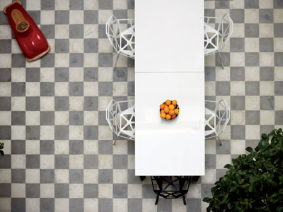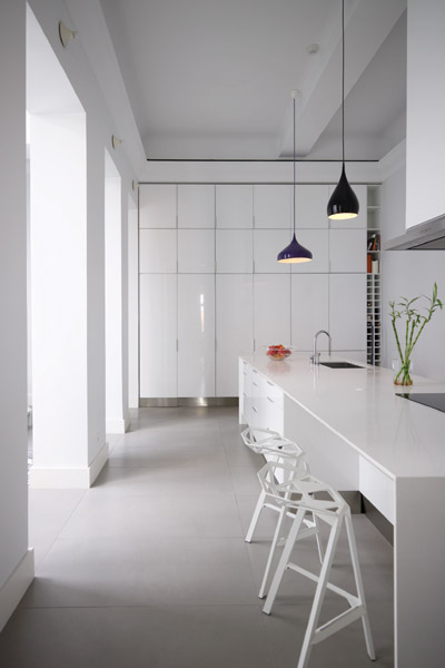 המטבח כולל אי מוארך, קיר ובו ארונות אחסון ומשטח העבודה – כולם יוצרו בהזמנה מיוחדת. פינת האוכל הממוקמת בסמוך למטבח מורכבת מכיסאות לבנים בעיצובו של פיליפ סטארק ומשולחן עגול ולבן מבית Knoll, בעיצובו של אירו סארינן, הידוע בעיצוב רהיטים בעלי צורה פיסולית. גוף התאורה הלבן מפלסטיק נרכש ב-Kartell.
