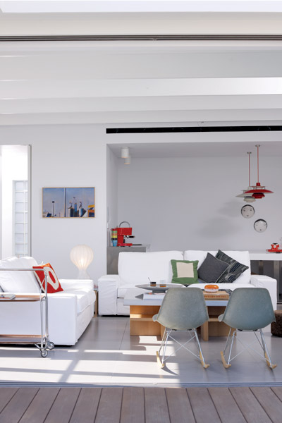 האדריכלית חושפת בגאווה שאת הספות הלבנות בקומת הגג רכשה דווקא באיקאה. "עבורי זה לא עניין של מחיר או האם הפריט עוצב על ידי מעצב מפורסם. זה יותר עניין של מראה ועיצוב. אני יכולה לאהוב פריט מאיקאה באותה מידה שאוהב פריט מפורסם ואיקוני שנקנה באלפי דולרים. אני פשוט אוהבת עיצוב לגופו של עניין. אני מאמינה שלא רחוק היום שבו חלק מהפריטים הנמכרים באיקאה יהפכו לפריטי אספנים".