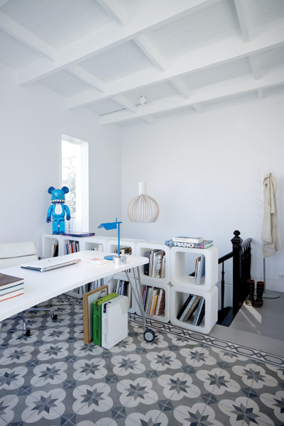 המשרד הביתי ממוקם בסמוך לגרם המדרגות וכולל שולחן עבודה שנרכש ב-Kartell, גוף תאורה שולחני כחול ממתכת של חברת העיצוב האיטלקית Flos שעוצב על ידי אדוארד בארבר וג'יי אוסגרבי וגוף תאורה התלוי מעל גרם המדרגות, שעוצב על ידי ספו קוהו, ארכיטקט ומעצב גופי תאורה מפינלנד לחברת Sekto Design.