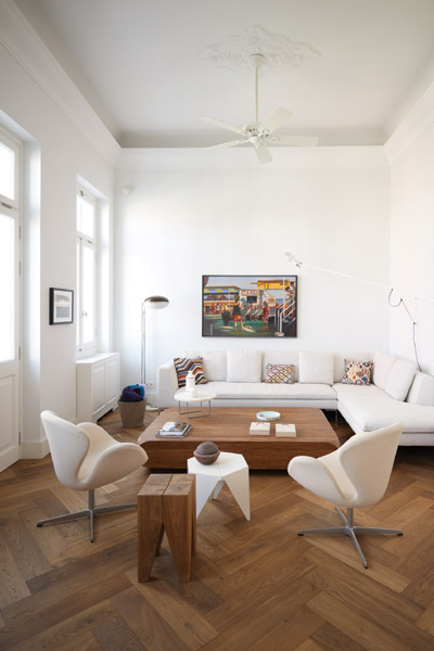 פינת הישיבה כוללת כורסאות לבנות מאיקאה לצד שולחן קפה שעוצב על ידי האדריכלית