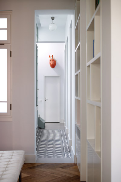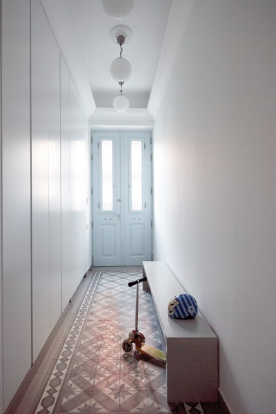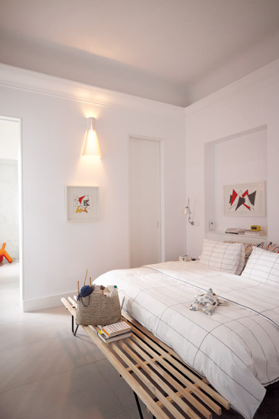 כל הקירות הפנימיים נהרסו והוחלפו בקירות חדשים ובפתחים נקיים וגדולים בעלי משקופים לבנים הכוללים דלתות הזזה, כדי לאפשר למשפחה מעבר חופשי בין חללים ולשמור על קשר עין בין ההורים לילדים. עיצוב הפנים הנקי והבהיר שולט גם בחדר ההורים שבו מיטה זוגית, ספסל ותמונות שנבחרו על ידי בני הזוג.