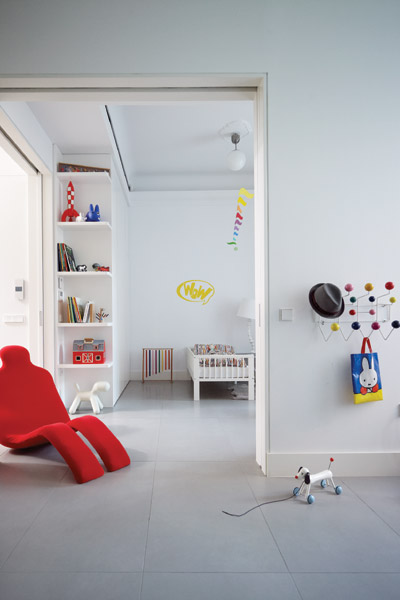 חדר הילדים מרוהט בשתי מיטות לבנות שנרכשו באיקאה, במדפים שעליהם מונחים הצעצועים הצבעוניים ובארונות קיר לבנים. על רקע ארונות אלה בולט כיסא אדום גדול המעוצב בצורת דמות יושבת. הכיסא נקרא "Bouloum Chaise" והוא עוצב בשנת 1968 על ידי המעצב הצרפתי הנודע אוליבייה מורג. המעצב אינו פעיל עוד אך עבודותיו ממשיכות להיות מוצגות במוזיאונים ונמכרות בחנויות עיצוב ברחבי צרפת.