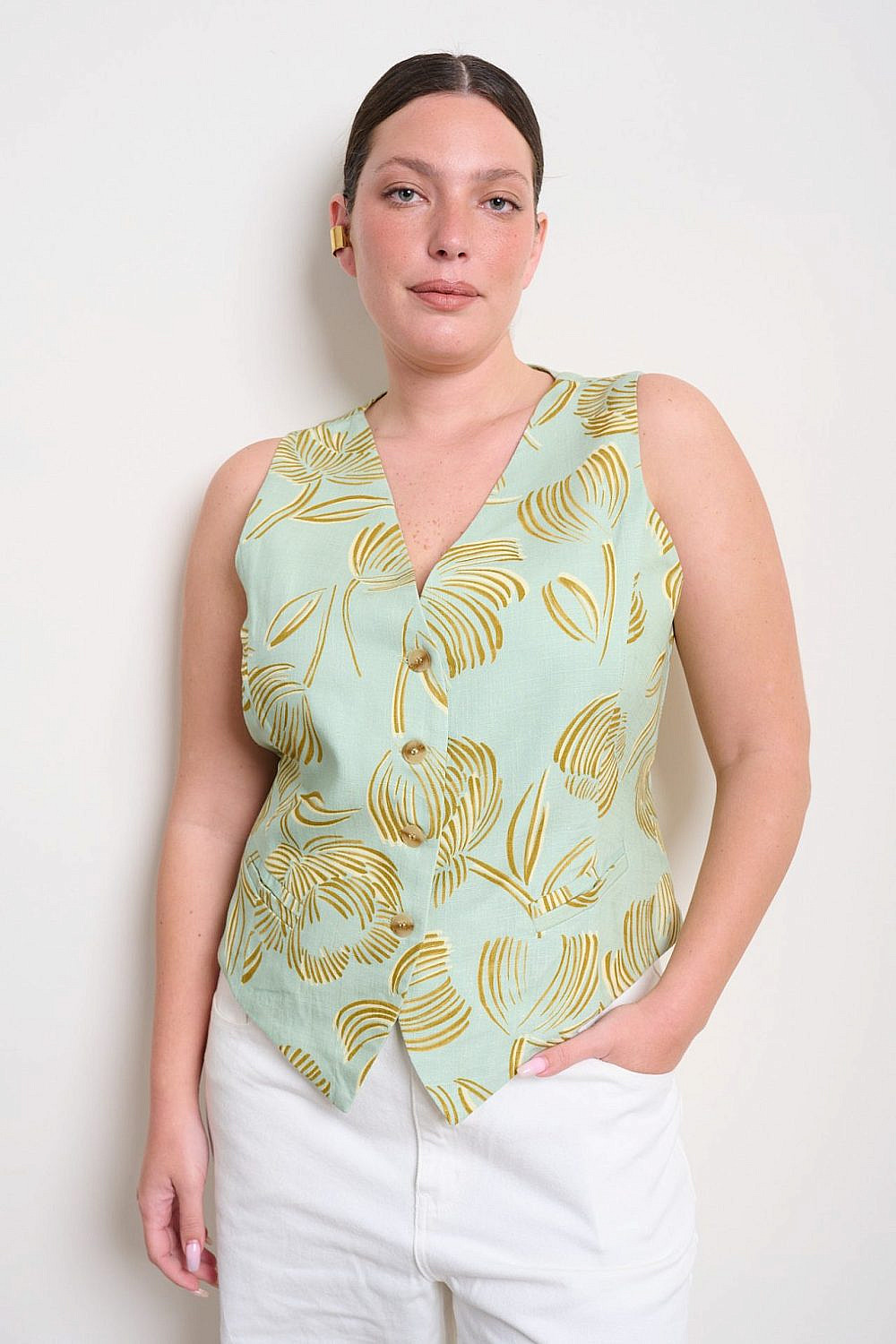 הפריט שתפס אותנו? וסט בגוון סלדין (שזה מן תכלת-אפרפר-ירקרק אם תהיתן), עשוי כותנה ארוגה עם הדפס ענפים מוזהב, באורך המדויק ובמפתח שמחמיא בול. להשיג בסטודיו של גלר באלקלעי 5, תל אביב – או באתר שלה, אם אתן בווייב של אונליין.