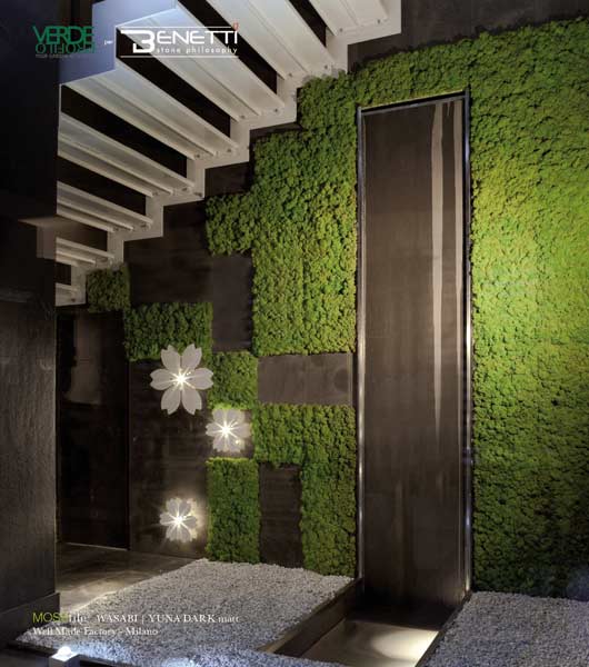 קירות ירוקים הם הדבר החם היום בעולם העיצוב. חברת האריחים האיטלקית Benetti מציעה לכם להפוך גם את חדר האמבטיה שלכם לירוק. החברה מציעה אריחים מרובעים בגודל 30X30 ס"מ, עשויים מרזין אקולוגי, ומוטבע בהם אזוב טבעי המיועד לשימוש בתוך הבית. את האריח מייצרים ללא שימוש בחומרים כימיים רעילים ואין צורך לדשן או להשקות את האזוב שמוטבע בו משום שהוא מתפתח בסביבה שיש בה 50 אחוזי לחות לפחות.