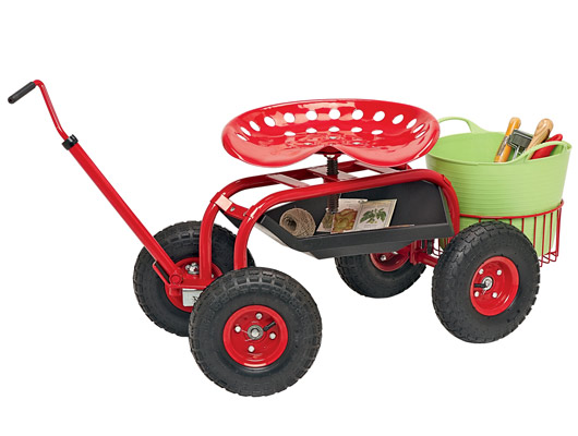 אם יש לכם גינה רחבת ידיים תוכלו להקל על עצמכם את מלאכת הגינון בעזרת טרקטורון נחמד שיכול לשמש גם ככיסא נוח בעת שתילה או ניכוש עשבים. אפשר לגרור את הכלי ברחבי הגינה בעזרת הידית הארוכה שלו ולהשתמש בו כמושב לביצוע עבודות שונות.
