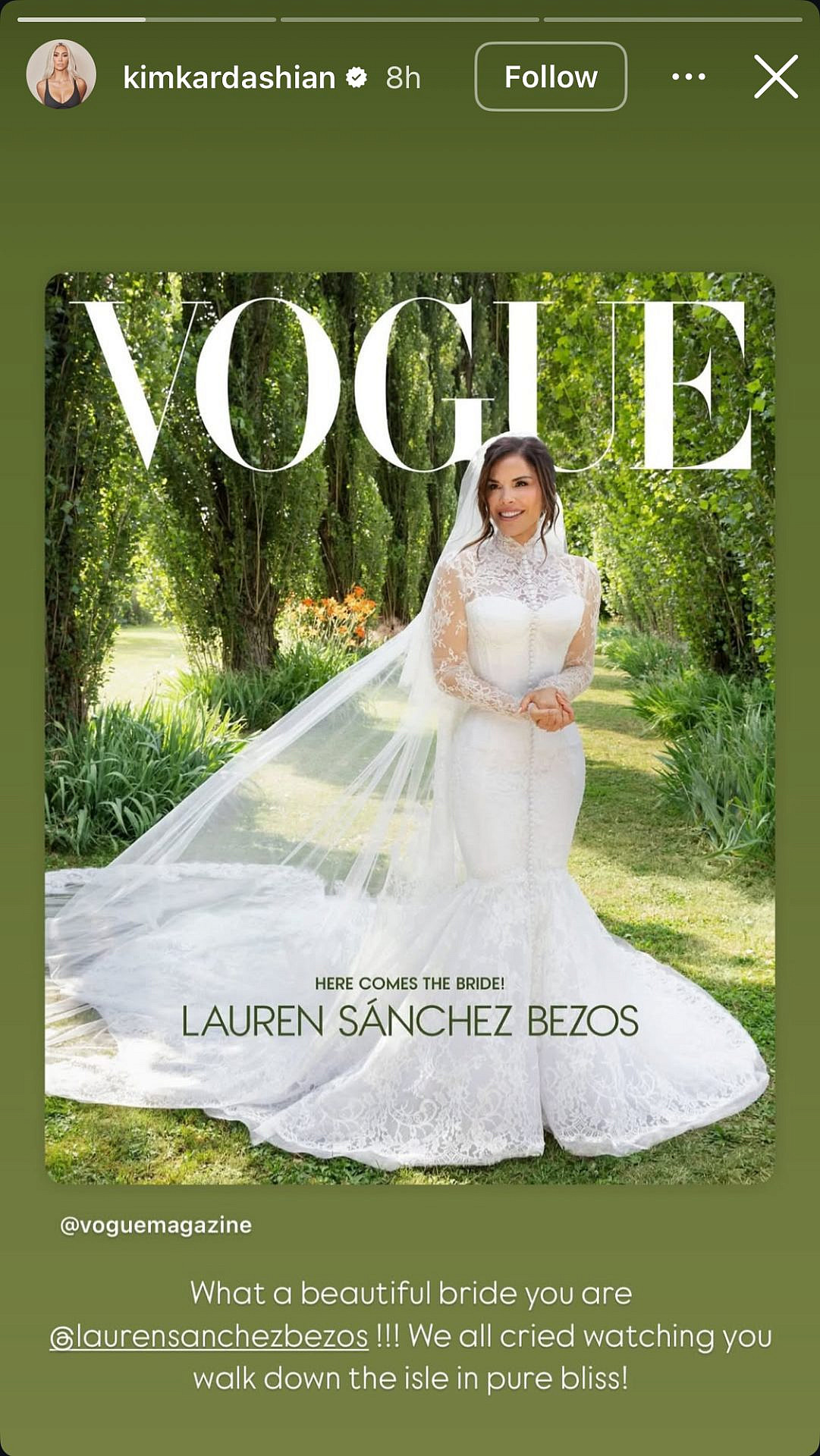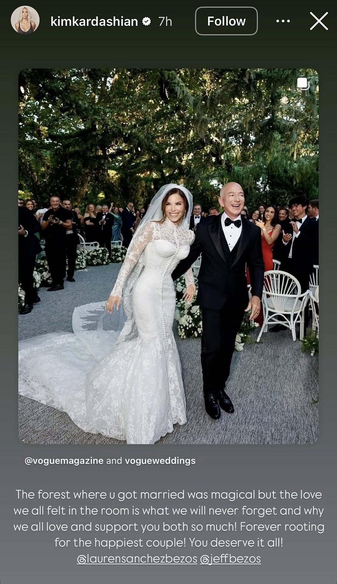 "איזו כלה יפהפייה את! כולנו בכינו מהתרגשות כשצפינו בך", פרגנה קים קרדשיאן בסטורי לכלת השמחה, והוסיפה: "המקום בו התחתנתם היה קסום, אבל האהבה שהרגשנו באוויר היא מה שלעולם לא נשכח. כולנו אוהבים ותומכים בשניכם. לנצח אצביע עבור הזוג הכי מאושר, זה כל כך מגיע לכם!".