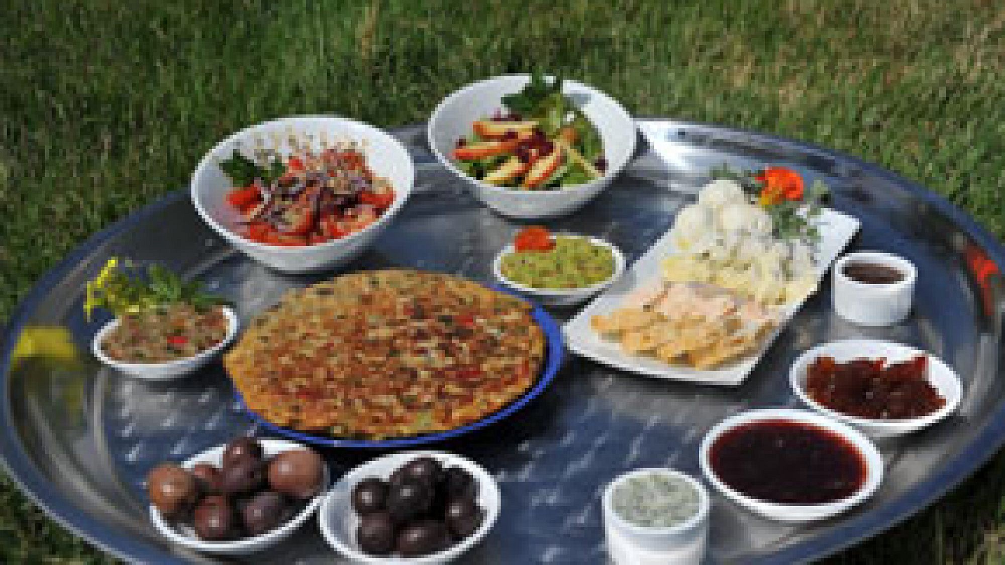 בערב נהנינו מארוחה קלה וביתית של סלט מקורי (חסה, עלי סלק, עלי כובע הנזיר, עלי נירית הקמה ופרחי בצל לבנים), פשטידת סלק בר, חצילים ופלפלים קלויים, מקלות קולורבי, גזר ופלפל בתנור וחמוצים. בבוקר, אחרי שינה ערבה במיטה המפנקת, קיבלנו לחדר מגש ענקי עם ארוחה טעימה, בריאה, עשירה ומושקעת. כדי שהארוחה תהיה כפרית כהלכה בחרנו לפצוח באכילה על הדשא שלצד הצימר.