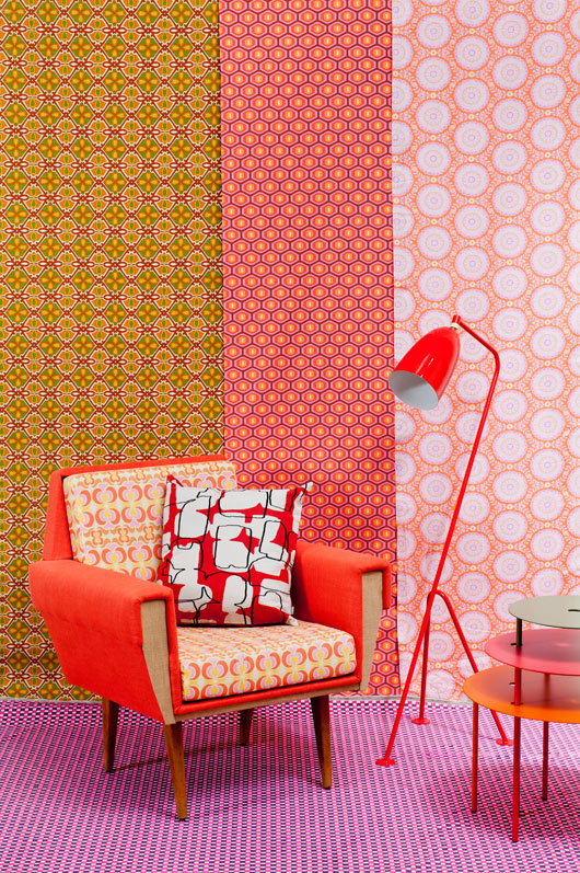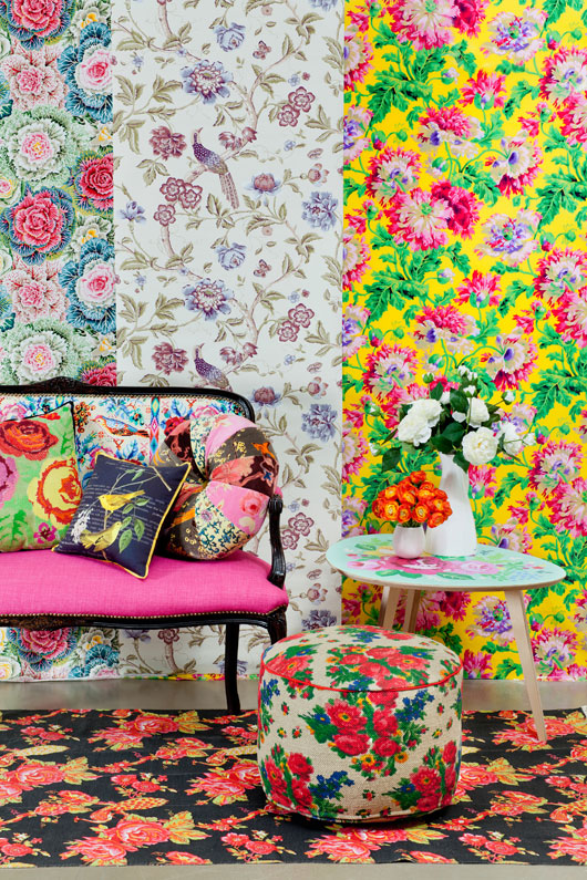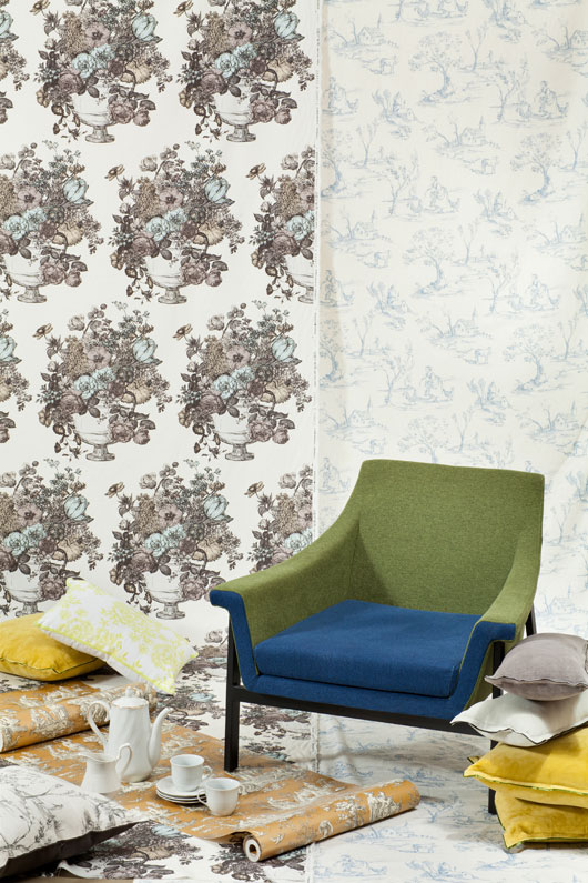 תלויים על הקיר: בד בהדפס איורים כפריים, 98 שקלים למטר; בד בהדפס אגרטל פרחים, 180 שקלים למטר; כרית בהדפס איורים כפריים, 160 שקלים. דנדו תל אביב # כורסת קטיפה, 2,990 שקלים; כריות קטיפה, 119־139 שקלים ליחידה. איי.די.דיזיין # טפט מוזהב עם איורים כפריים, 520 שקלים לגליל. מאיירס טפטים # כרית עם רקמת פרחים, 175 שקלים. קאס אוסטרליה