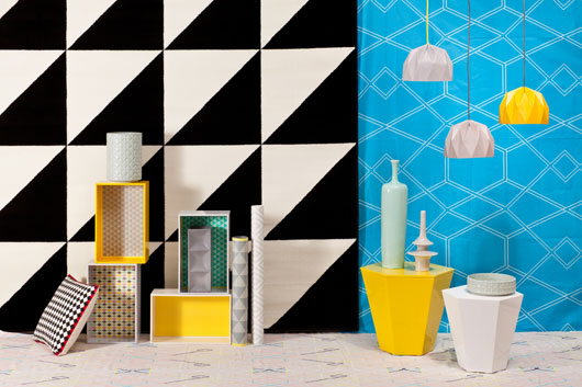 תלויים על הקיר: שעוונית בצבע טורקיז, 39 שקלים; שטיח משולשים בשחור־לבן, 695 שקלים; על הרצפה: בד בהדפס גרפי, 39 שקלים למטר. איקאה # שולחנות צד משושים המשמשים גם לאחסון, 990 שקלים לזוג; אגרטלים וכלי חרס בטורקיז ואפור, 99־199 שקלים ליחידה; כרית, 279 שקלים. איי.די.דיזיין # מנורות אוריגמי, 219 שקלים ליחידה; קופסאות למידוף ממתכת עם רקעים מגנטיים, 290 שקלים ליחידה; מגולגל, שטיח לינולאום בדוגמת משולשים, 289 שקלים. טווילינגן # מגולגל, טפט לבן בדוגמה גרפית אפורה, 630 שקלים לגליל. מאיירס טפטים