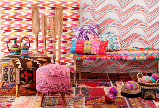 תלויים על הקיר: בד פשתן בדוגמת פסים מעוקמים, 360 שקלים למטר; בד רקום בדוגמת איקאט, 180 שקלים למטר; כרית בהדפס איקאט סגול ולבן, 155 שקלים. דנדו תל אביב # כרית בז' רקומה, 245 שקלים. קאס אוסטרליה # כרית תפורה מחמישה בדים שונים, 249 שקלים; אגרטלים מלופפים בחבלים, 220 שקלים ליחידה. ג'ינג'ר # שולחן מלופף בחבלים, 2,190 שקלים; כדורים מלופפים בחבלים, גדול, 49 שקלים, קטן, 29.90 שקלים; פסלי עץ עומדים, 198 שקלים ליחידה. ביתילי # סלסילות שונות, 49־59 שקלים ליחידה. איי.די.דיזיין # הדומים, גדול, 2,800 שקלים, קטן, 1,500 שקלים. קסטיאל as is # שטיח טלאים, 9,500 שקלים. כרמל שטיחים ופרקט