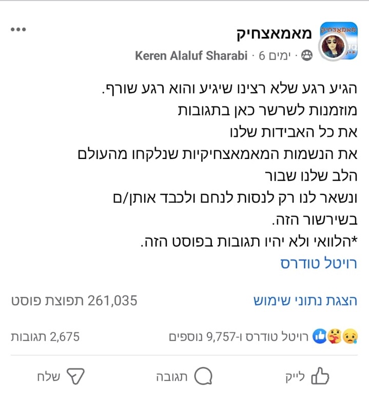 קרן אלאלוף שרעבי, מנהלת "מאמאצחיק", לא תיארה לעצמה שהקהילה הגדולה והמצחיקה ברשת תהפוך לקבוצה מלאת אבל ואף תאבד חלק מחברותיה במלחמה. איך הן מצליחות לשמור על הומור בתוך כל הכאב?