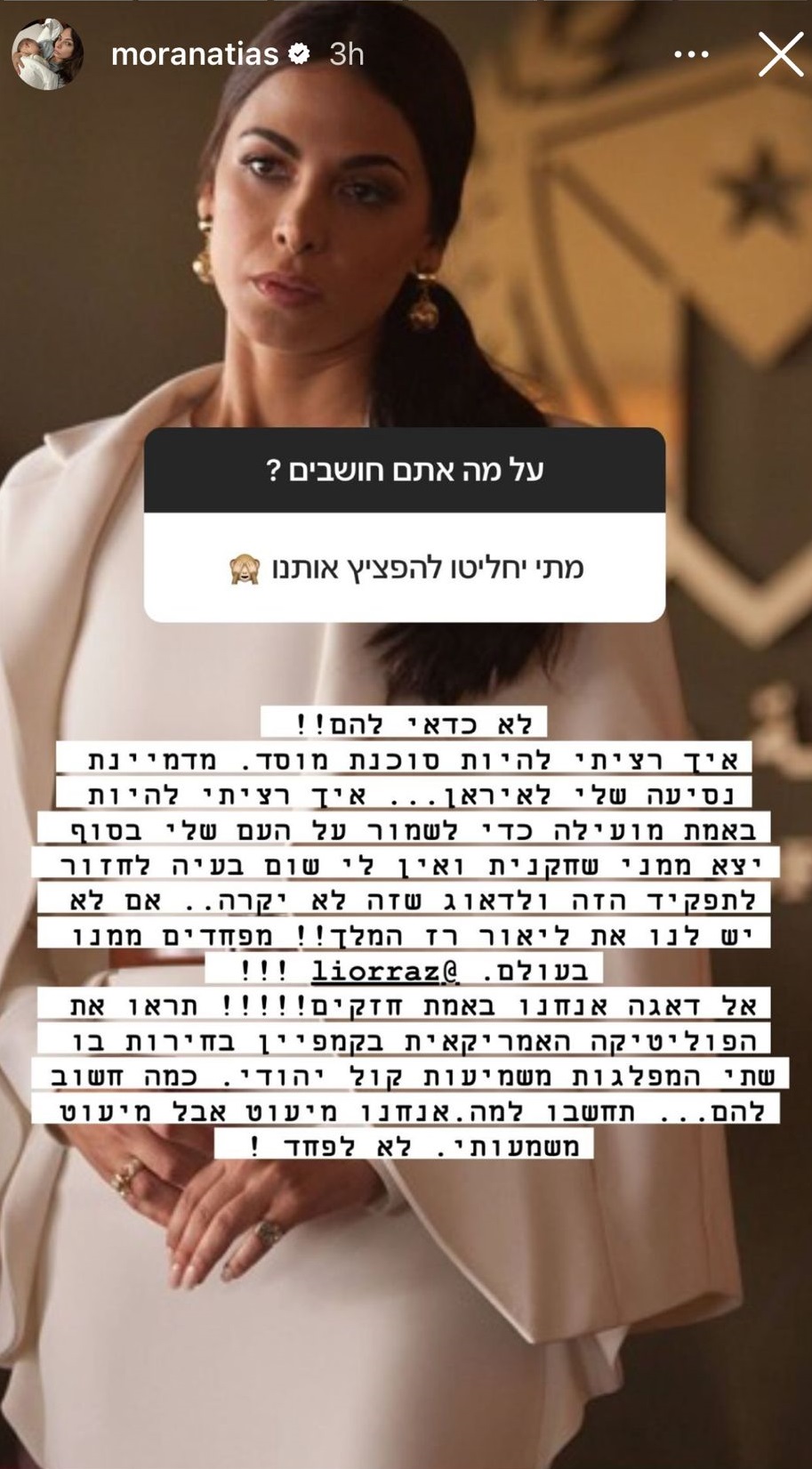 בראיון שערכנו איתה לאחרונה היא פתחה את הלב וסיפרה איך פרצה בדמעות כשהתקשרה ליעקב ארגמני, אבא של נועה ארגמני כדי לברך אותו על שחרורה ושיתפה בתחושות הקשות, בפחד מהבורות ומהאלימות הגוברת. אתמול אטיאס העלתה לאינסטגרם סשן שאלות ותשובות. כשאחת העוקבות שלה העלתה את שאלת השאלות של השבועיים האחרונים, "מתי יחליטו להפציץ אותנו?", אטיאס ענתה ועל הדרך התוודתה: "לא כדאי להם! איך רציתי להיות סוכנת מוסד. מדמיינת נסיעה שלי לאיראן. איך רציתי להיות באמת מועילה כדי לשמור על העם שלי, בסוף יצא ממני שחקנית". מצדיעות לך מורן, ואולי מחכה לך תפקיד בעונה הבאה של "טהרן" אחרי שיתסרטו את החיסול של הנייה.