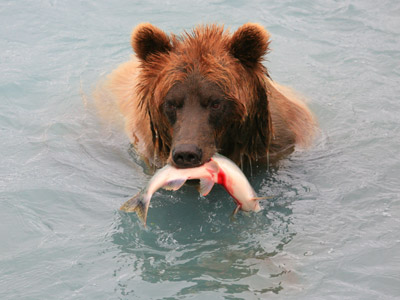 זאת הייתה נדידת הסלמון (salmon run) הראשונה והגדולה של השנה – הגל הראשון, שנמשך ימים ספורים בחודש יוני, של להקות עצומות של סלמונים המגיעות להטיל את הביצים שמהן יבקע הדור הבא. אנחנו שתינו בירה, והדובים חגגו עם סושי מאולתר. אבל אנחנו והדובים לא היינו היחידים שחיכו לסלמונים בשפך הנהר. על הגדה ניצבו שורות של דייגים עם חכות מתוחכמות ושלפו מהמים קילוגרמים מפרכסים של דגים שבשרם אדום. גם בתוך המים המתינו לדגים סכנות.