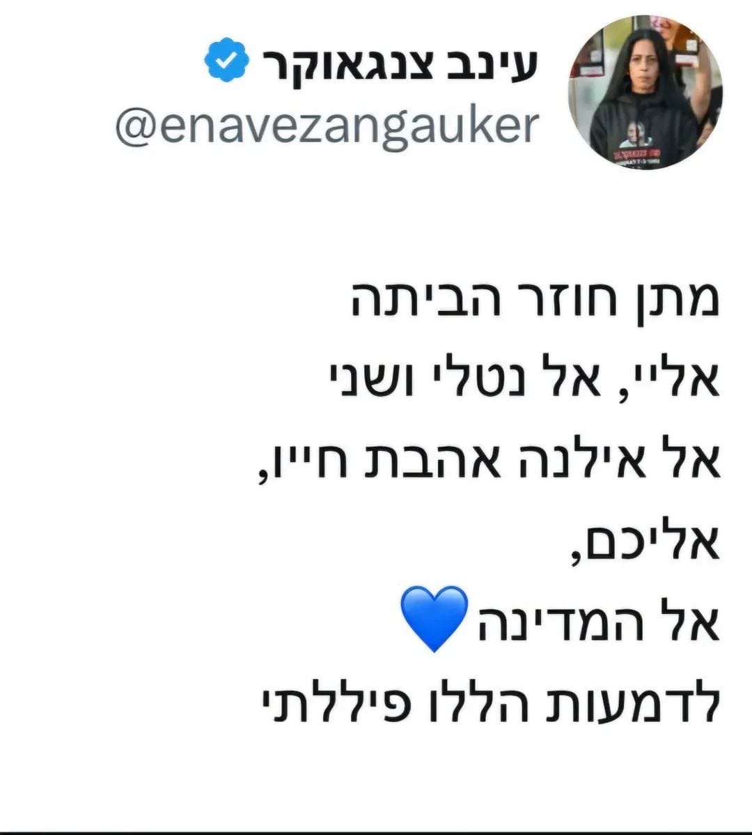 עינב צנגאוקר, אמו של מתן צנגאוקר, שנחטף ב-7 באוקטובר 2023 מביתו בנחל עוז, פרסמה לאחר הבשורה הדרמטית ציוץ ברשת X: "מתן חוזר הביתה. אליי, אל נטלי ושני, אל אילנה אהבת חייו, אליכם, אל המדינה. לדמעות האלו פיללתי".