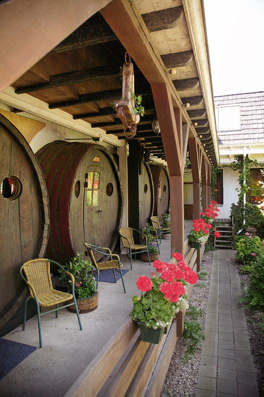 ב־Stavoren, כפר קטן על חוף מפרץ אייסל שבהולנד, נמצא מלון שחלק מחדריו הם חביות יין שהוסבו למגורים. ארבע חביות עץ אלון בנפח 15 אלף ליטרים כל אחת הובאו משווייץ, שופצו ועוצבו מחדש. העץ מתיישן עם הזמן, מתכהה ומוסיף לאווירה האינטימית שמקורה באופי המבנה עצמו. החביות הוצבו זו לצד זו ומעליהן הוקם מבנה שמשמש בכמה פונקציות כגון גגון להגנה מפני גשם ותשתית לאינסטלציה. בכניסה לכל חבית תוכננה פינת ישיבה, ושירותים ומקלחות מוקמו מאחור. החביות עצמן מהוות חדרי שינה ובכל אחת יש שתי מיטות. בקרוב מצפים הבעלים לשמונה חביות עץ אלון נוספות שיגיעו מצרפת בקיבולת 22 אלף ליטרים כל אחת, גדולות מספיק כדי להכיל מיטה זוגית.