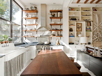במרכז המטבח ניצב אי המשמש כמשטח עבודה. על הקיר תלויים מדפי עץ שנמצאו בטחנת רוח מצפון לניו יורק ועליהם הונח אוסף הכלים של בעלי הבית