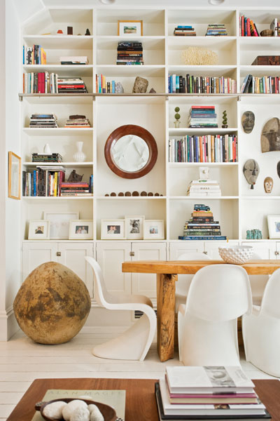 סביב האח המרכזית בנה קרול ספרייה קבועה מעץ, הממלאת את הקיר כולו וכוללת מדפים רבים. מעליה מסגר חלל ייעודי להצגת פסל אמנותי מעץ, מעשה ידיו