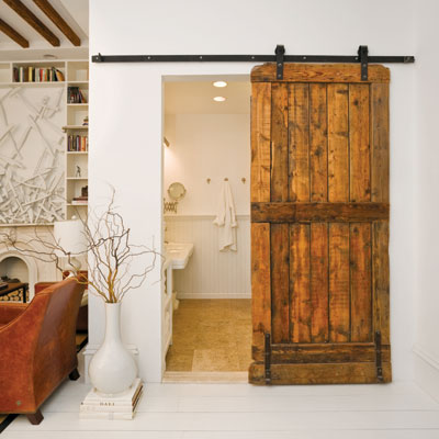 דלת אסם ישנה, שנלקחה מהחווה שבה גדל קרול, מוקמה בכניסה לשירותים באמצעות מסילה עליונה