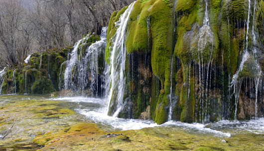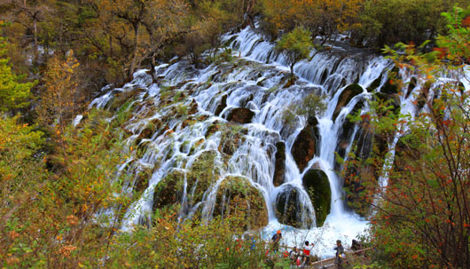 אלפי סינים – מקבוצות עובדים מאורגנות ועד סבתות על עקבים עם בלוני חמצן בגודל של בקבוק פפסי הנמכרים בקיוסקים שבכניסה – טיפסו במסע הצליינות המודרני הזה כשהם מתנשפים במאות המדרגות המוליכות אל קצהו העליון של העמק, עוצרים מדי פעם למנוחה באחד מהמקדשים או הביתנים שלאורך שבילי העץ ומסניפים את המראות. מגובה של כ-4,000 מטר, במקום שבו ניצבות שתי פגודות אבן עתיקות, הבריכות החלקות כמראות נראות כמו מחרוזת ענקית של קריסטלים נוצצים בכל גוני הכחול והירוק. מי שמתעצל יכול לעלות את כל הדרך ברכבל שהותקן במקום לפני כשבע שנים, אבל אז מפסידים חוויה אנתרופולוגית של טיפוס והתחככות בעשרות אלפי עולי הרגל הסינים.